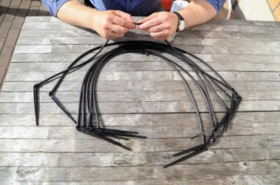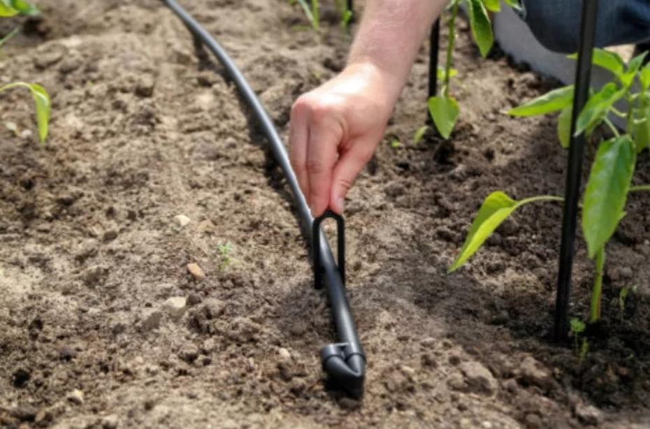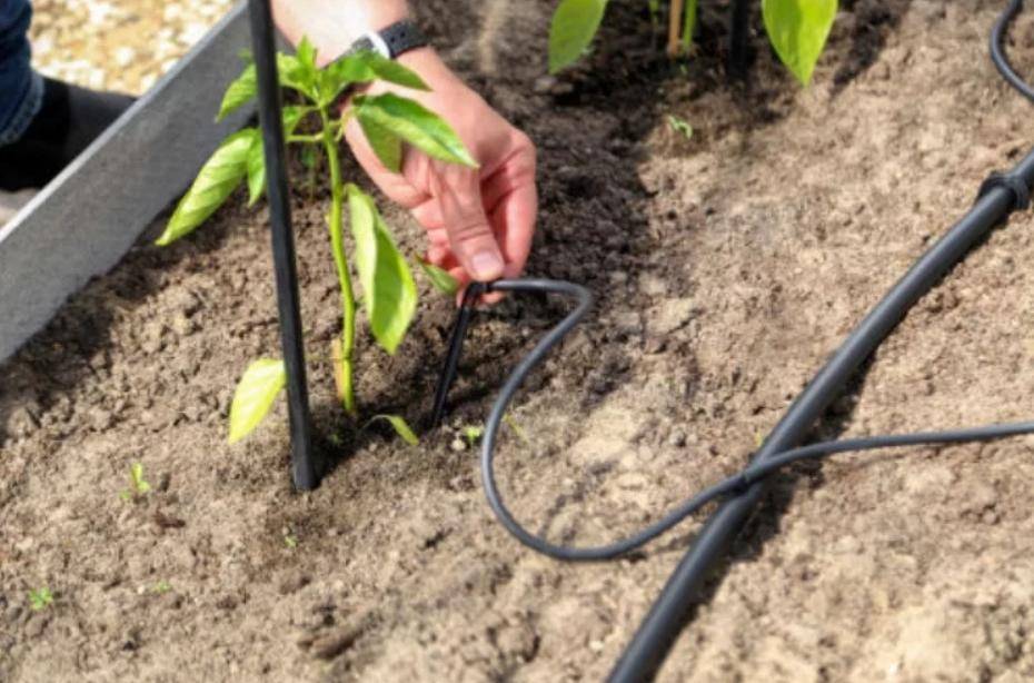 - Конец каждого магистрального шланга согните и закрепите специальным зажимом, который можно найти в купленном комплекте либо докупить отдельно. Получившийся магистральный шланг аккуратно разложите между растениями, фиксируя прижимами на равном удалении друг от друга.
