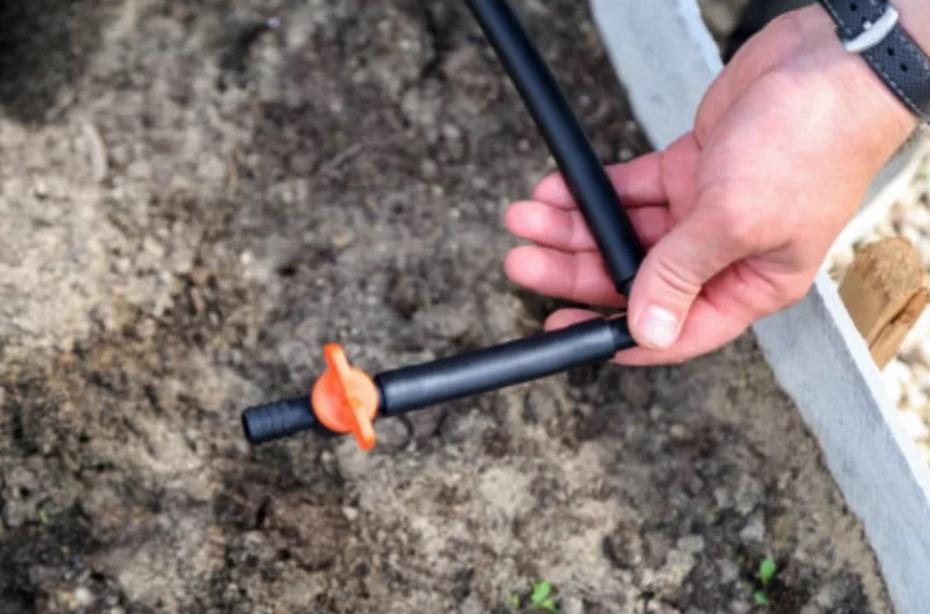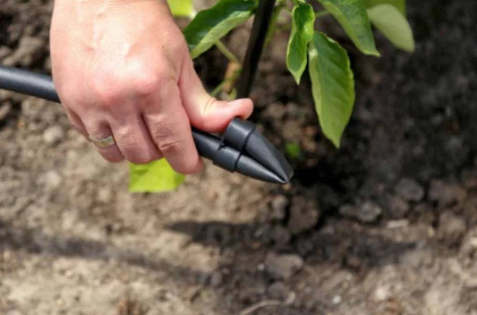Для получения максимально аккуратного отверстия, крепко фиксируя шланг рукой и немного надавливая с раскачиванием проколите магистральный шланг. В каждое отверстие вставьте фитинг типа «тройник», который предварительно был установлен на принесенных ранее подводящих соединенных шлангах. Капельницы, присоединенные к подводящим шлангам, погрузите в землю недалеко от растений, прямо под корень.
