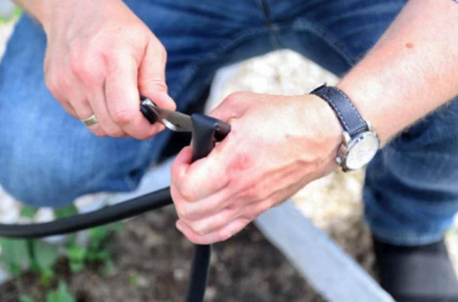 - Прокладка магистральных шлангов. В случае наличия двух и более грядок магистральный шланг отрежьте равными частями длины грядки. Шланг легко отрезается ножницами или простым ножом.