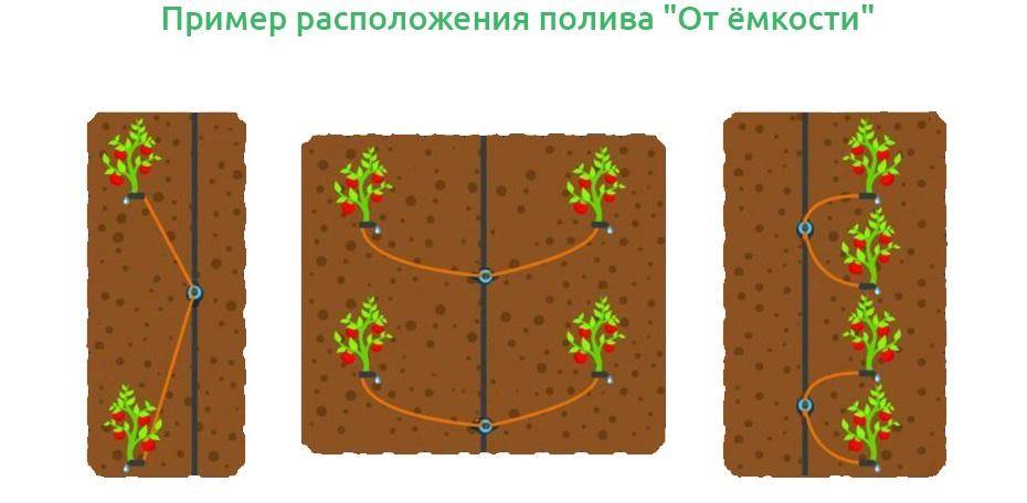 - Шланги прокладываются так, чтобы охватить каждый куст. Если помидоры высажены в два ряда, достаточно расположить конструкцию по периметру.
