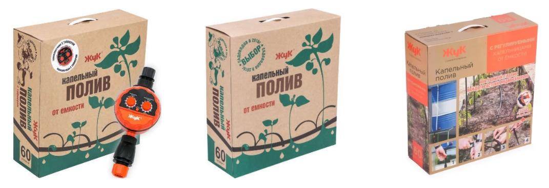 Системы для капельного полива «Жук» изготавливаются фирмой Cicle (Цикл), расположенной во Владимирской области. Свое наименование они получили благодаря характерному расположению капельниц. От главных труб расходится много мелких, расходящихся попарно друг напротив друга. Это капельницы – трубки из ПВХ для подачи воды к корням растений. Их диаметр не более 2 см.