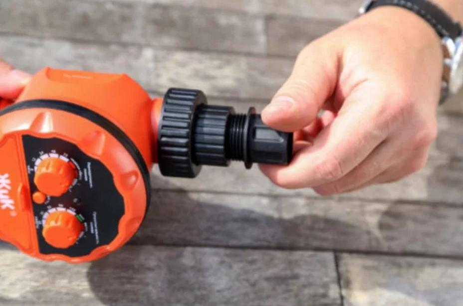 - В свободный конец угла наденьте небольшой кусок в 10 сантиметров отрезанного магистрального шланга. подключается краник регулировки потока воды на грядку.