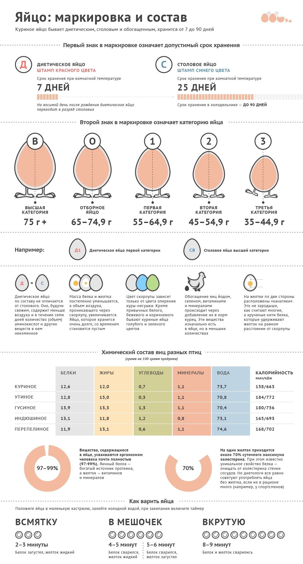 Яйца с маркировками СО, С1, С2, С3 различаются по весу. Чем больше цифра, тем меньше весит яйцо. Яйца с маркировками С и Д – столовые и диетические. Различаются по свежести, диетическим нет и недели, столовые же хранят до 25 дней