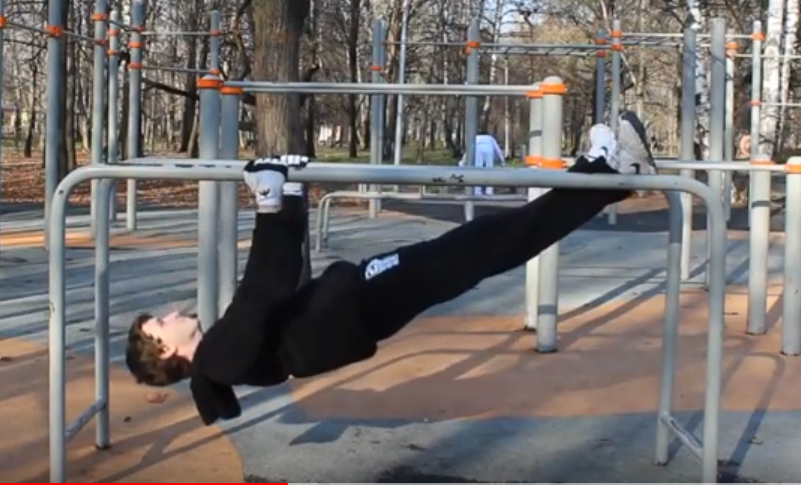 Пожалуй, это не самый лучший метод для начинающих. Нужно подставить под турник стул, чтобы вы могли выйти на исходную позицию с помощью ног, или же найти низкий турник. Далее, постепенно расслабляем ноги, пока вся нагрузка от удержания тела в этом положении не распределится на руки и спину.