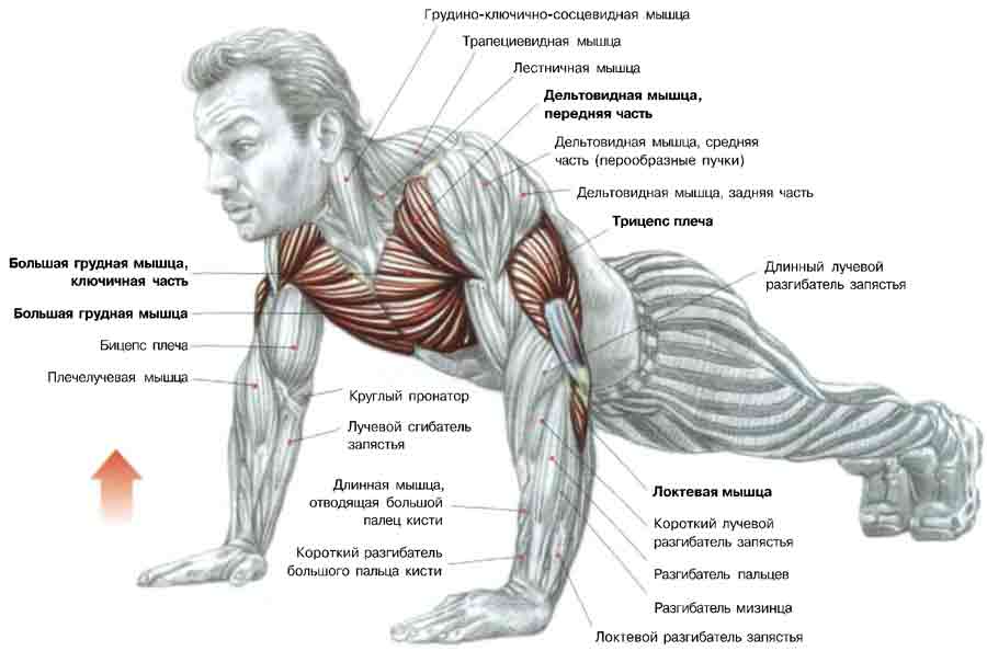 Отжимаясь, боксер в первую очередь развивает грудную клетку, трицепс, плечевые мышцы.