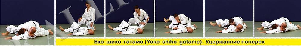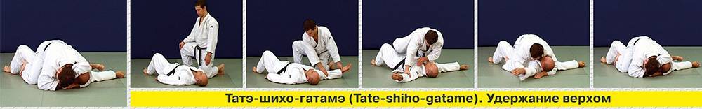 Удэ-хишиги-ваки-гатамэ Рычаг локтя внутрь захватом руки под мышку Удэ-хишиги-хара-гатамэ Рычаг локтя внутрь через живот Удэ-хишиги-хидза-гатамэ Рычаг локтя внутрь при помощи колена сверху Удэ-хишиги-удэ-гатамэ Рычаг локтя внутрь прижимая руку к ключице Удэ-хишиги-аши-гатамэ Рычаг локтя внутрь ногой Цуккоми-джимэ Удушение спереди двумя отворотами Кататэ-джимэ Удушение спереди предплечьем Санкаку-джимэ Удушение захватом головы и руки ногами - Дополнительный материал