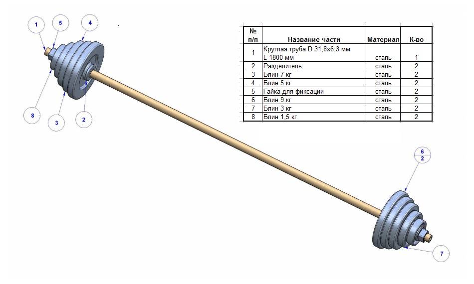 диаметром 32 миллиметра и толщиной стенки не меньше 6 миллиметров. Нужно ее 1,6-1,8 метра. Магазинный гриф из стали весит 20 кг, а в длину он – 2,2 метра. Таких характеристик (веса и прочности) не дают подручные материалы. Даже, достав трубу с толщиной металла 8 мм, не дотянуться до указанных параметров грифа стандартного. Учитывая, что наиболее распространенными являются трубы, стенка которых равна 6 мм, удается достичь веса 7 кг, взяв длину 1,8 м. (Почему, чтобы сделать самодельную штангу не рекомендуется большая длина? Она из-за низкой прочности просто не выдержит такой вес, как заводской гриф. Прочнее самодельная штанга будет, если взять большую толщину металла, но даже это значительно не добавит веса. Здесь и это нужно учитывать, и ориентироваться на стоимость. Дорогой вариант – стальной кругляк, конечно, более надежный и эффективный. Далее, на концах выбранной трубы нарезают резьбу – на 20 сантиметров с каждой стороны.) -  Разделители для блинов