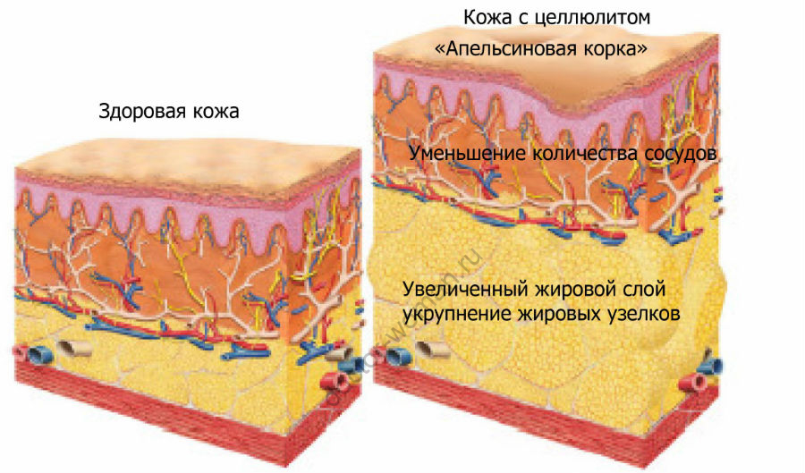 Жировая прослойка, образованная ячейками из волокон, которые соединяют верхний слой кожи с глубокими тканями, и образует ту самую бугристую поверхность. Если происходит увеличение объема жировых клеток (адипоцитов), то это сразу нарушает гладкость кожи; ячейки начинают выделяться, формируются бугорки и ямочки.