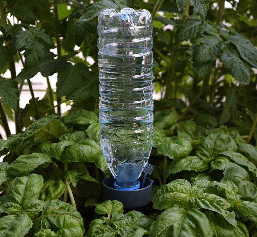 Еще один способ: вместо крышки прикручивают специальную конусную насадку с отверстиями. Ее продают в хозяйственном магазине. Конус втыкают в землю, а емкость заполняют водой через обрезанное дно.