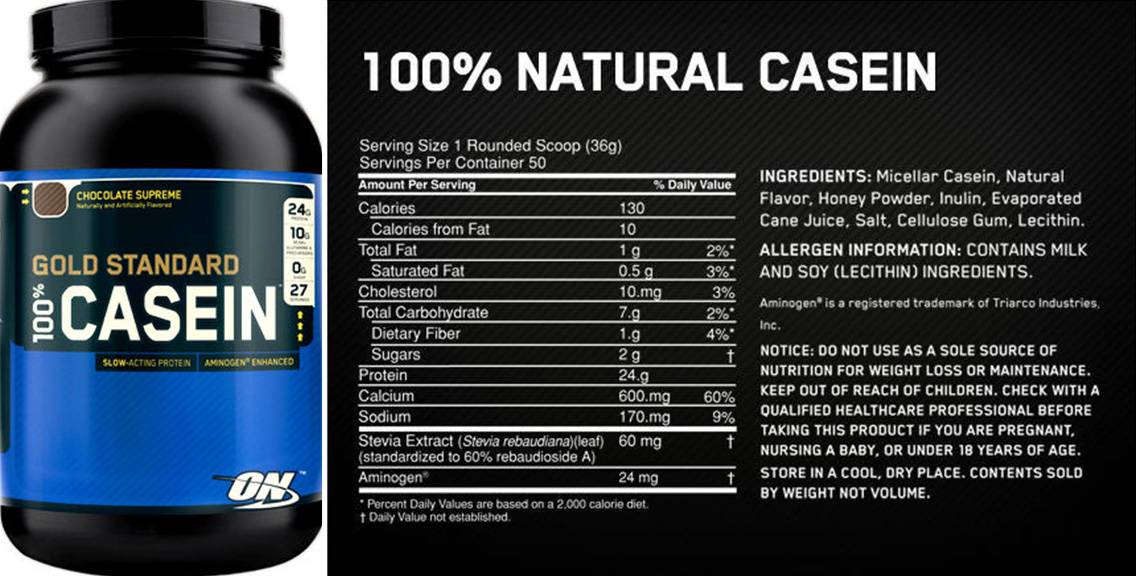 Лидером среди добавок считается Gold Standard 100% Casein. Это комплекс, выпускаемый компанией Optimum Nutrition, в одном купе которого содержится 34 грамма протеина, 24 из которых приходится на казеин в чистом виде. Данный продукт лидирует среди аналогов, является ценным источником протеина, подавляющим катаболизм, стимулирующим прирост мышц.