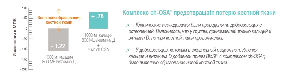 Важно понимать, что увеличение МПК на 2% – это выше того, чего можно достичь, принимая только кальций и витамин D. Испытания комплекса ch-OSA в BioSil показали не только обратную потерю костной ткани, он фактически создал новую кость