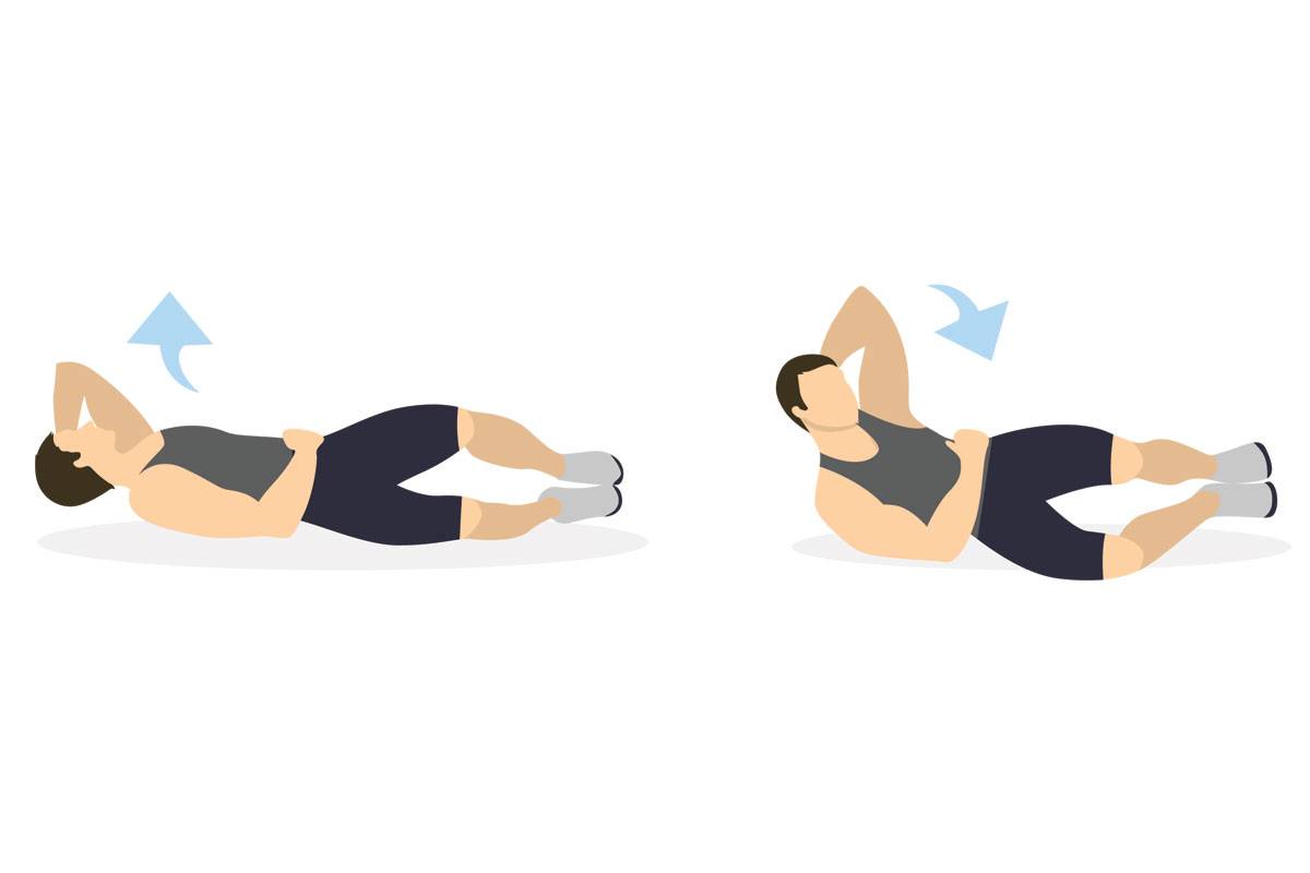 Исходное положение: лежа на спине, ноги согнуты в коленях и плотно стоят на полу (для придания дополнительной стабильности их может придерживать тренер). За счет активации абдоминальных мышц плавно поднимите плечи вверх (буквально на 10-15 см), одновременно округляя спину и скручиваясь по направлению к коленям. Задержитесь на 1-2 сек, затем медленно опустите корпус, однако не касайтесь плечами пола.
