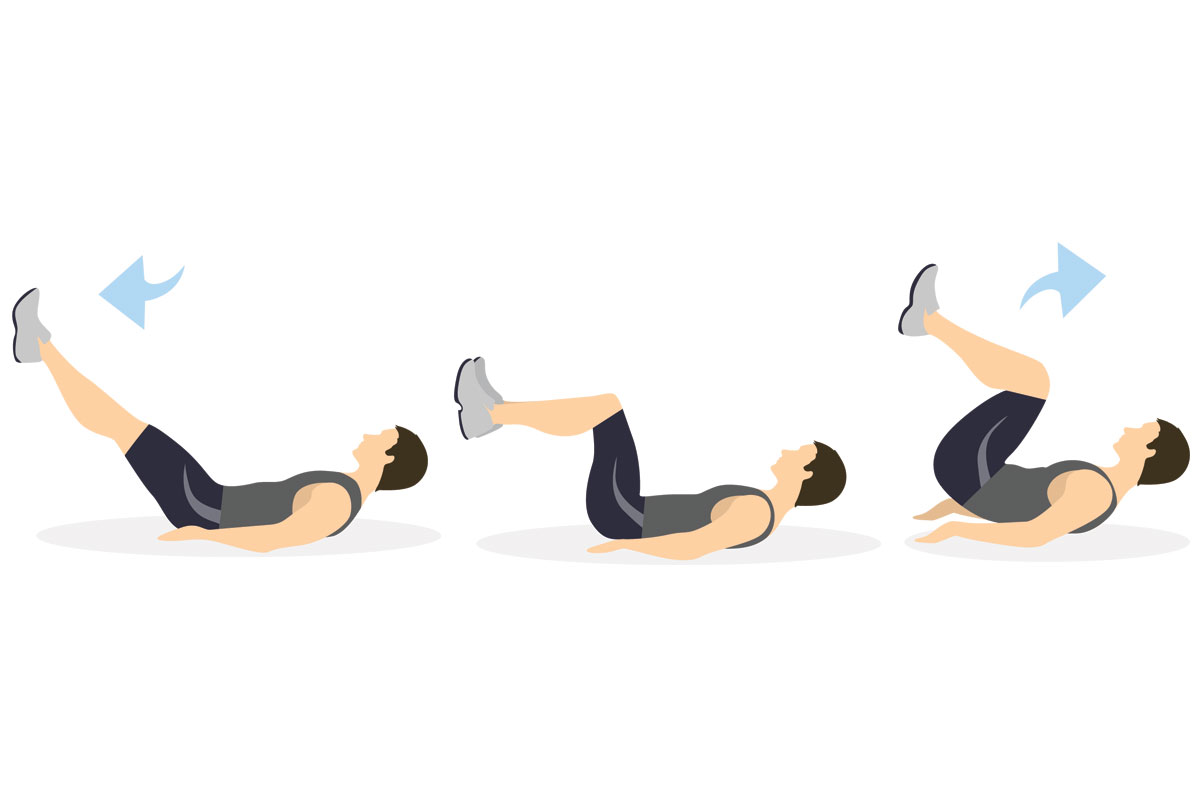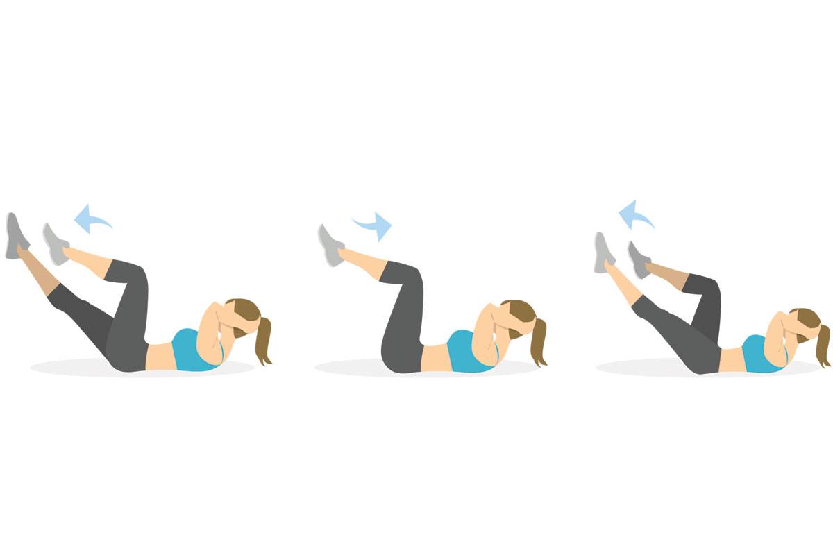 Упражнение совмещает классические скручивания с поочередным подтягиванием ног по направлению к груди. Развивает косые и внутренние мышцы живота.