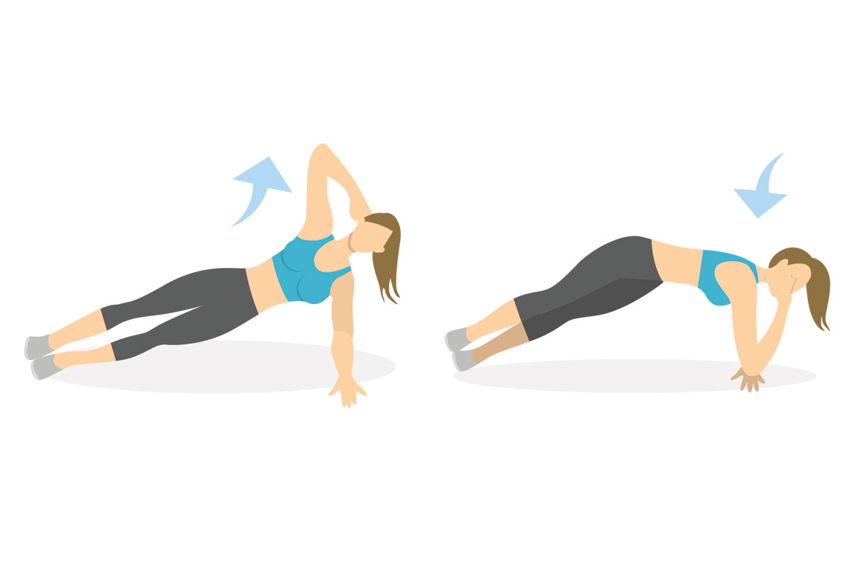 Встаньте в планку на предплечьях, держите спину прямо, не провисая в пояснице. Оторвите правую руку от пола и разверните корпус вправо, опираясь на одно предплечье. Вернитесь в исходное положение и теперь разверните корпус влево. Упражнения из планки прорабатывают не только пресс, но также укрепляют кор и спину.