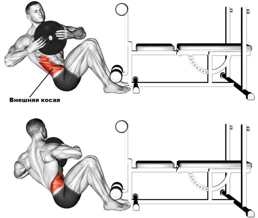 Ну а «продвинутые» атлеты могут сделать свои скручивания двойного типа более сложными и разнообразными. Такие же действия можно делать с большим напряжением за счет наклона — на скамье. Если пресс уже натренирован и требует нагрузки более серьезной, можно заниматься с дополнительным весом. Например, с гантелью, блином (от той же штанги), их можно убрать за голову. Ту же гантель либо блин можно зажать между коленями. Один мой знакомый тренер также советует применять утяжелители в зоне щиколоток.