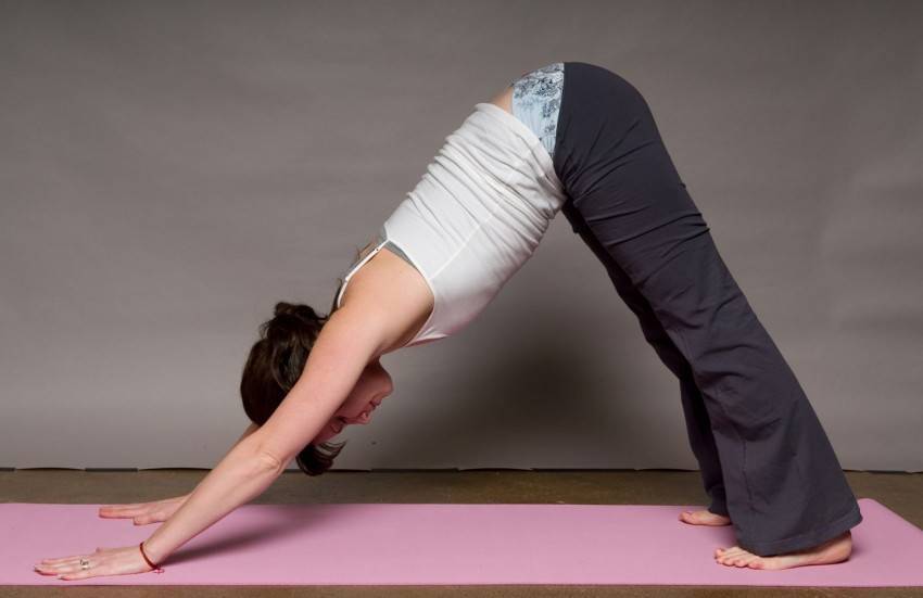 - Адхо Мукха Шванасана. Эта асана требует перемещения веса всей верхней половины тела только на руки, в результате чего можно быстро укрепить бицепсы и избавиться от лишних килограмм. При этом надо соблюдать спокойное и ровное дыхание.
