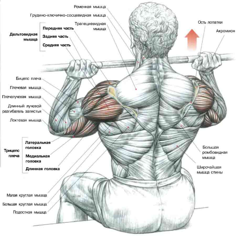 Жим штанги с груди — это наиболее базовое упражнение, которое более всего нагружает переднюю и среднюю части дельтовидных мышц, ключичную часть грудной мышцы, верхний отдел трапециевидных мышц, трицепсы, передние зубчатые мышцы и глубоко расположенную надостную мышцу.Жим штанги с груди можно выполнять как в положении сидя, так и в положении стоя. Выполняя это упражнение в положении стоя, не следует слишком сильно прогибать поясницу. Чтобы увеличить нагрузку на передние части дельтовидных мышц, заведите локти слегка вперед. Для более интенсивного воздействия на средние отделы дельтовидных мышц локти лучше раздвинуть (развести в стороны).