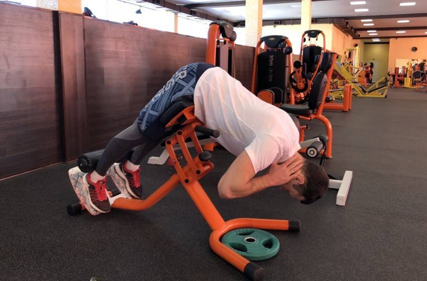 Гиперэкстензия. Упражнение направлено на развитие бицепса бедра, а также на укрепление поясничного отдела. Для усложнения вы можете использовать диск.Лягте на опору животом. Верхняя часть туловища от талии находиться на весу, диск прижат к груди. За счёт напряжения бицепсов бедра и ягодиц поднимитекорпус назад и вверх. Во всех баховых упражнениях гиревого спорта большую нагрузку получает спина, как верхняя часть, так и поясничный отдел. Гиперэкстензия является одним из лучших упражнений по укреплению поясницы.
