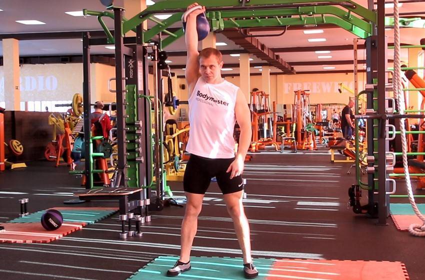 - При опускании гири отводите плечи немного назад. Это позволит затрачивать меньше сил на выполнение.