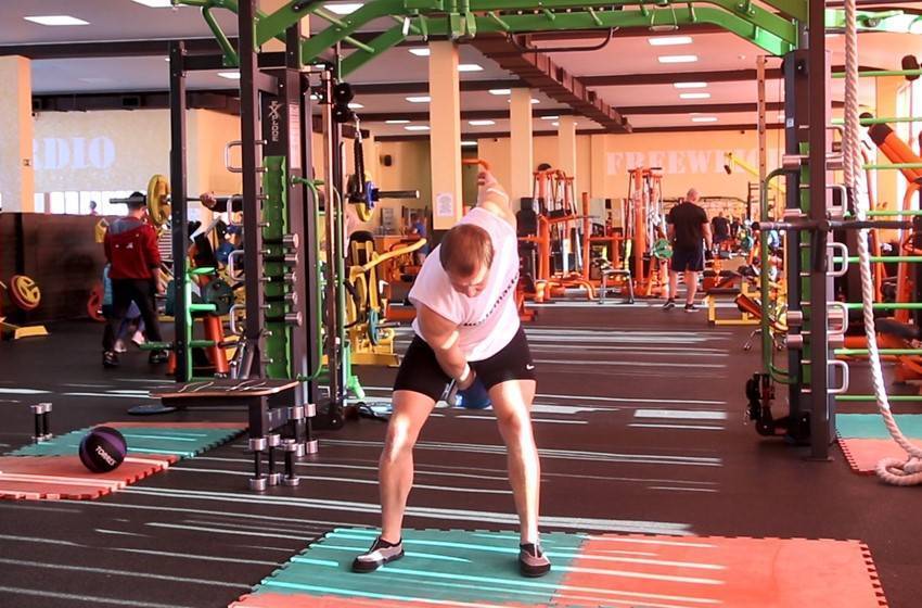 - Далее, вашей задачей будет, сохраняя прямую спину, подорвать снаряд с земли и сделать замах назад. В нижней точке траектории ваш корпус должен быть практически параллелен полу. Движение вы совершаете по большей части за счет вращения в тазобедренных суставах. Колени сгибаются и разгибаются незначительно, спина в движении участвует опосредованно.