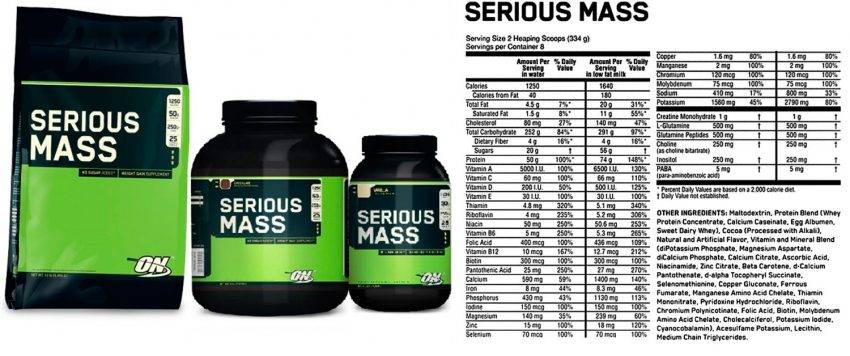 В одной порции добавки содержится около 1250 калорий, 50 граммов протеина и более 250 грамм углеводов. Кроме этого, в составе serious mass есть более двадцати полезных микроэлементов и витаминов, которые восстанавливают организм и ускоряют рост мышечных волокон.