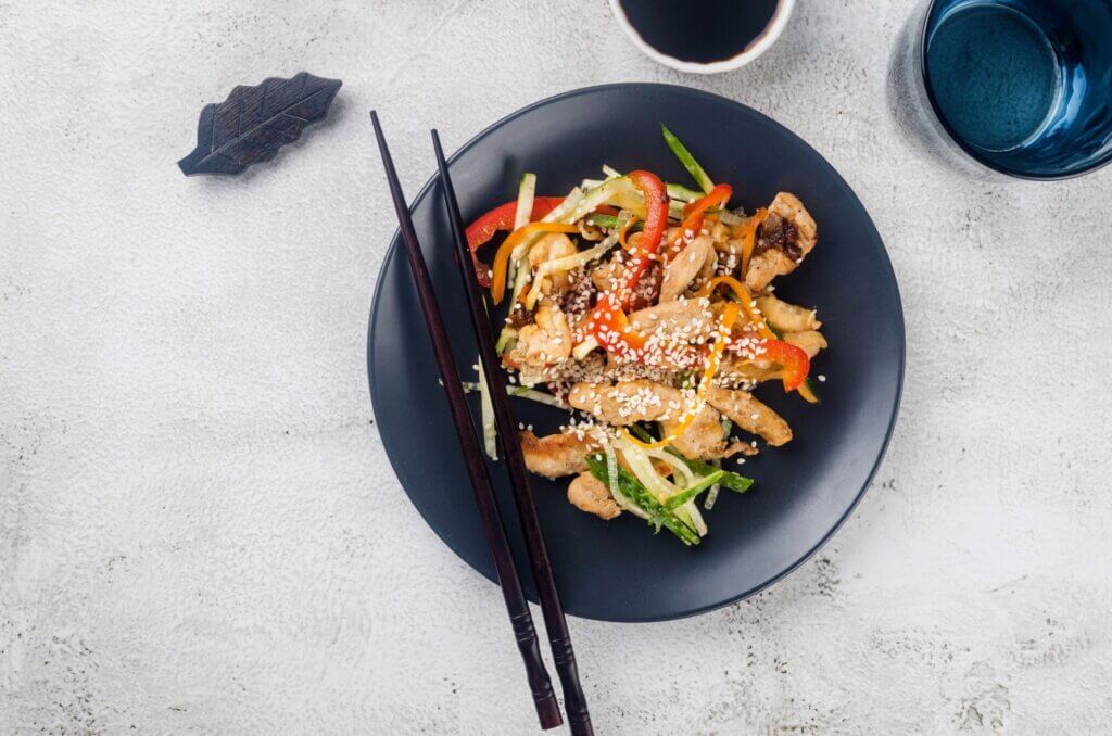 Отварите куриную грудку до готовности, затем дайте ей остыть и нарежьте ломтиками.Нарежьте томат и пекинскую капусту, добавьте к ним фасоль (если берете консервированную, обратите внимание, чтобы в составе не было сахара) и ломтики грудки. Посолите и поперчите, аккуратно перемешайте, присыпьте кунжутом и подавайте