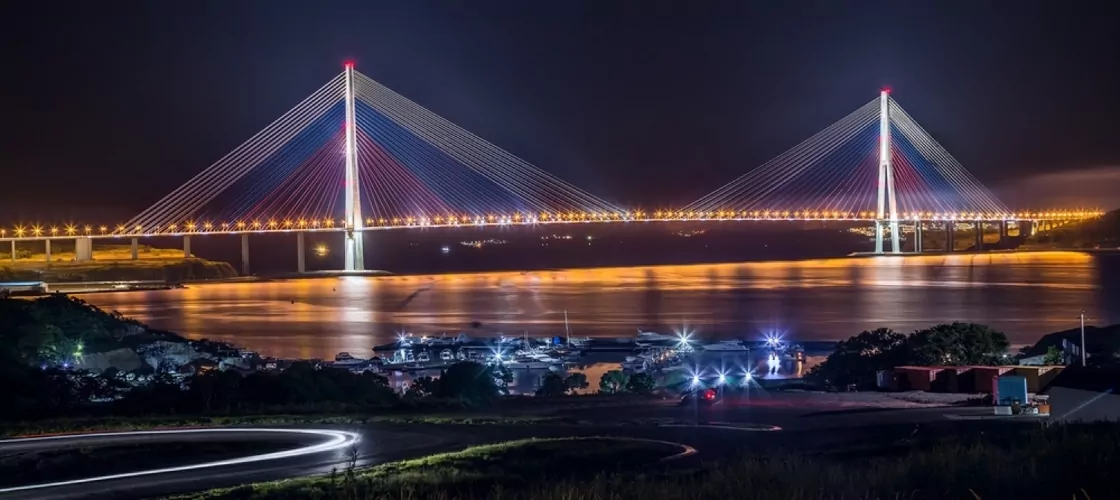 Русский мост расположен во Владивостоке. Он, перекинувшись через пролив Босфор Восточный, соединяет п-ов Назимова и мыс Новосильского на острове Русский. Чтобы доехать до моста, сначала нужно добраться до Владивостокского федерального округа в Приморском крае России. Отправляясь в поездку из столицы, вы должны учесть, что Владивосток расположен в семи часовых поясах от Москвы и отдалён от неё более чем на девять тысяч км.