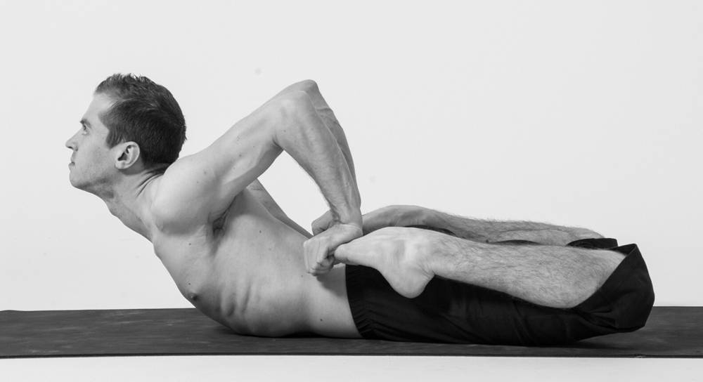 Лягте на живот. Протяните руки назад и попытайтесь захватить ноги, согните колени и подтяните пятки к ягодицам. На выдохе поднимите грудь и тяните лопатки навстречу друг другу. Убедитесь, что пятки касаются бедер, и держите пальцы ног. Задержитесь в этом положении в течение приблизительно минуты и постепенно возвращайтесь в исходное положение.