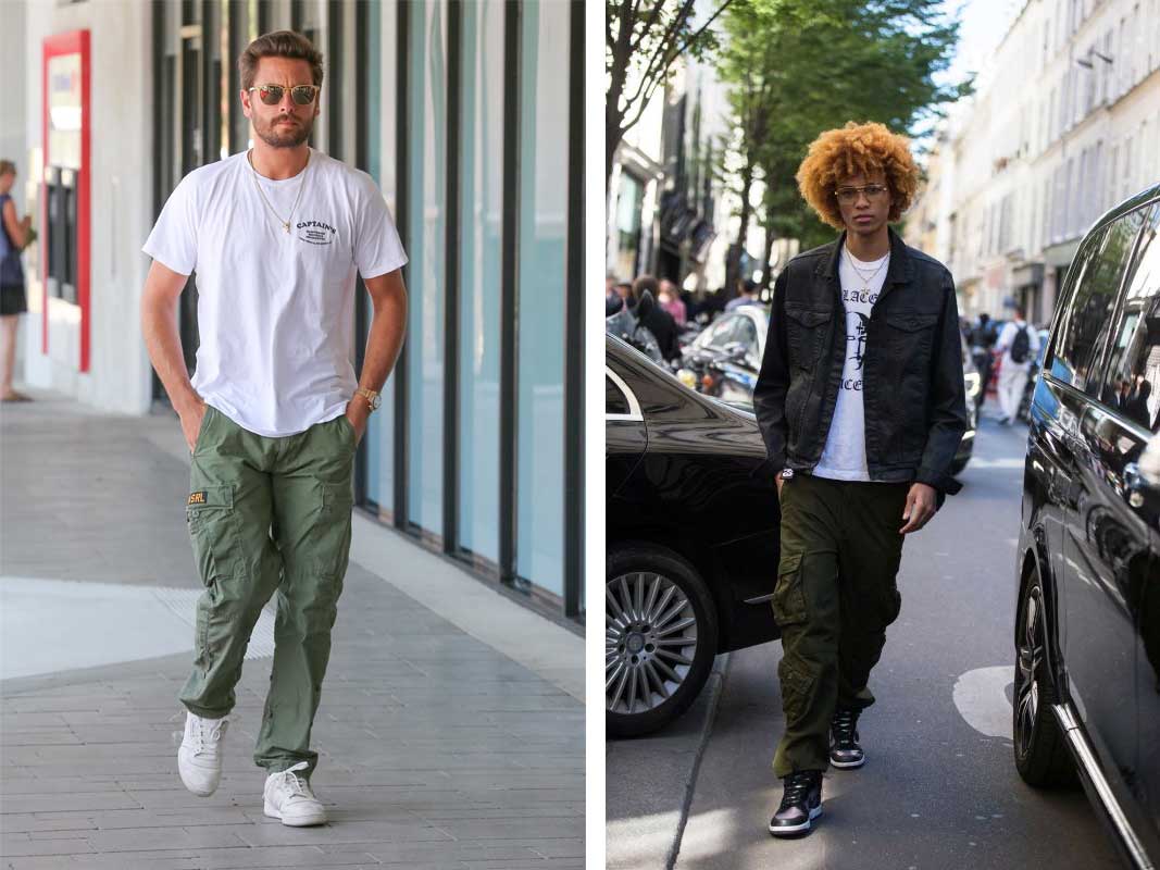 Помимо привычных для этих моделей тканей, на подиумах были представлены и более интересные – например, кожа, и трикотаж. Стилизовать брюки карго проще всего в привычной «походной» стилистике: с объемными рубашками в клетку, куртками и бомберами, а также обувью с очевидно спортивным вайбом.