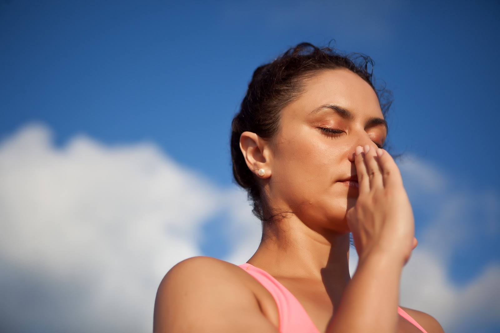 - Перекройте правую ноздрю. Сделайте 5 дыхательных циклов (вдохов и выдохов) через левую.