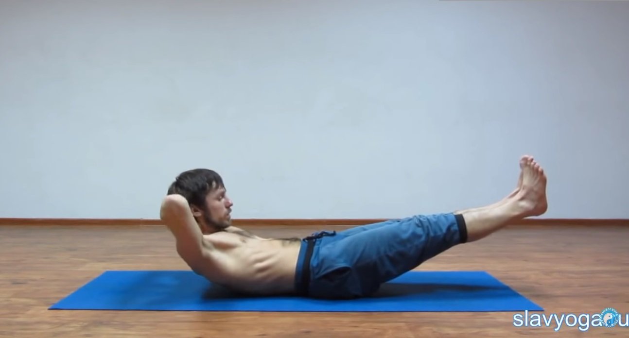 Еще один вариант Ардха Навасаны позволяет эффективно вытянуть позвоночник и при этом хорошенько проработать верхний участок брюшного пресса: верхняя половина тела в том же положении, что и в классическом варианте, а ноги не подняты, а вытянуты на полу либо с оттянутыми носками, либо с подошвой, перпендикулярной полу, и носками, натянутыми на себя.