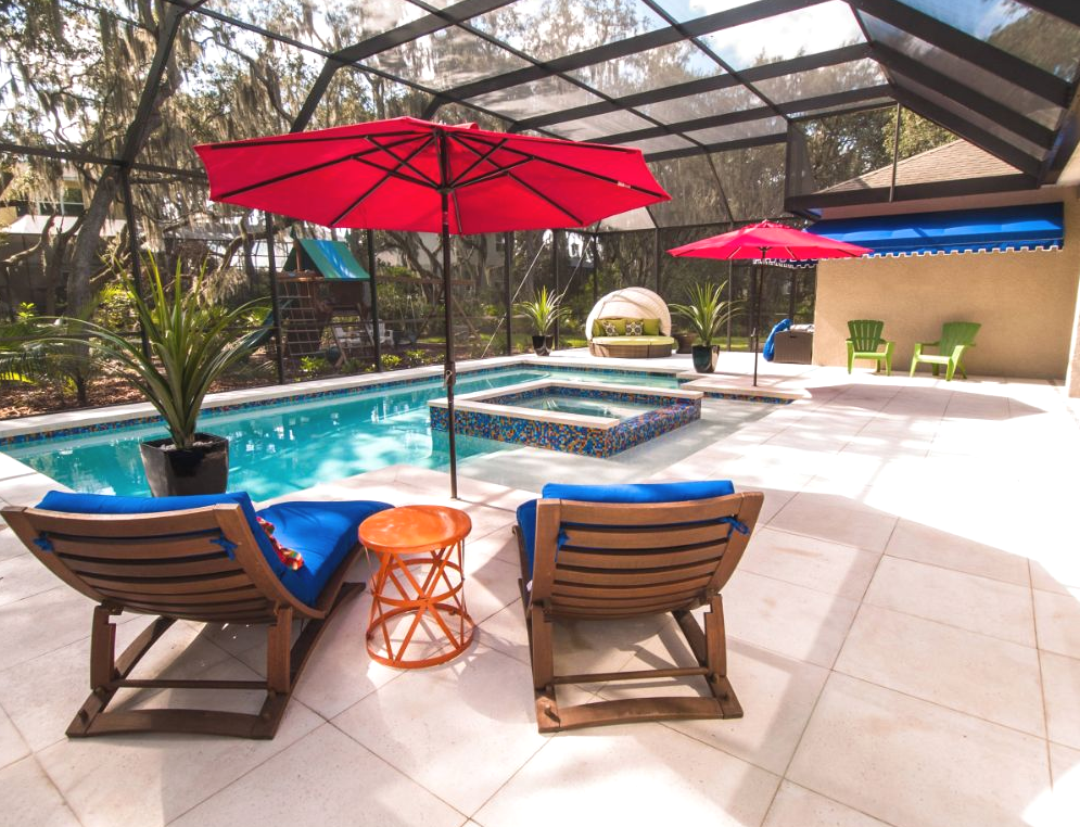 На этом строительство навеса для бассейна окончено, остается только провести уборку и расставить шезлонги.