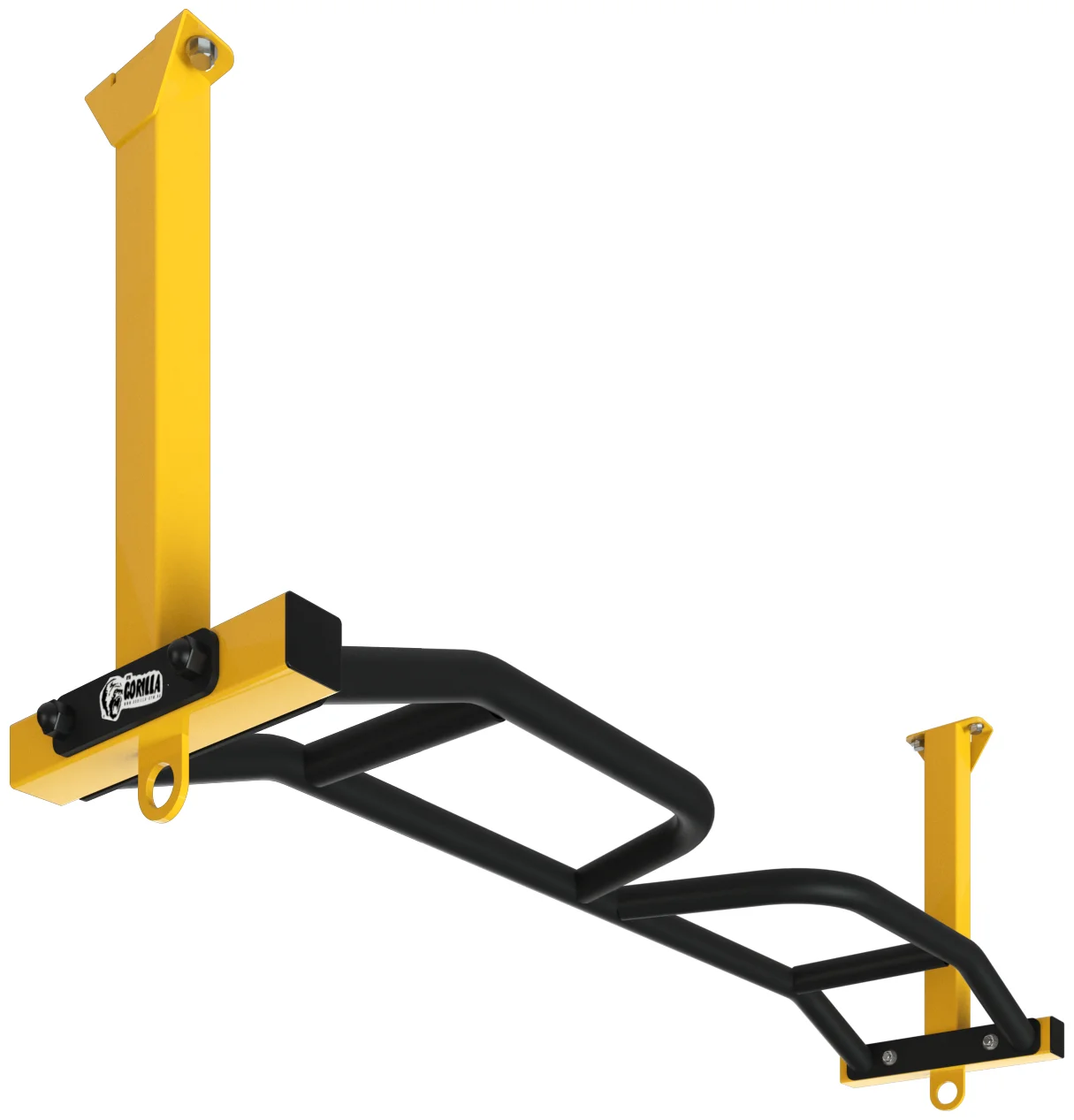 Навесное приспособление крепится анкерами и длинными болтами к потолку. Если закрепить турник далеко от стены, то на нем можно будет выполнять даже сложные гимнастические элементы. Обычная потолочная перекладина может быть оборудована рукоятками для прямого хвата, кольцами, поперечными перемычками. Некоторые модели можно регулировать по высоте, при необходимости опуская немного ниже.