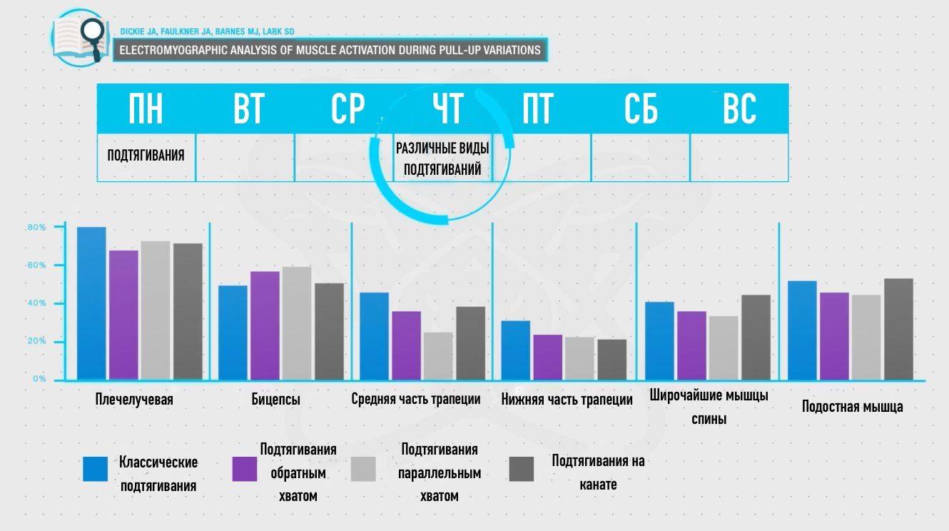- Я бы также порекомендовал один из дней разбавлять различными вариациями подтягиваний (удержание над перекладиной, подтягивания с параллельным хватом и т.п.). В данном случае задействованные мышечные группы работают несколько иначе6, нежели чем при классических подтягиваниях, что не только поможет добиться результатов в традиционных подтягиваниях, но и предотвратить развитие травм, вызванных чрезмерной нагрузкой. В особенности с отягощением.