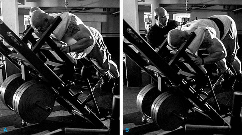 Никогда не отрывайте таз от тренажера: как и спина, он всегда должен вплотную соприкасаться со спинкой Гакк машины.