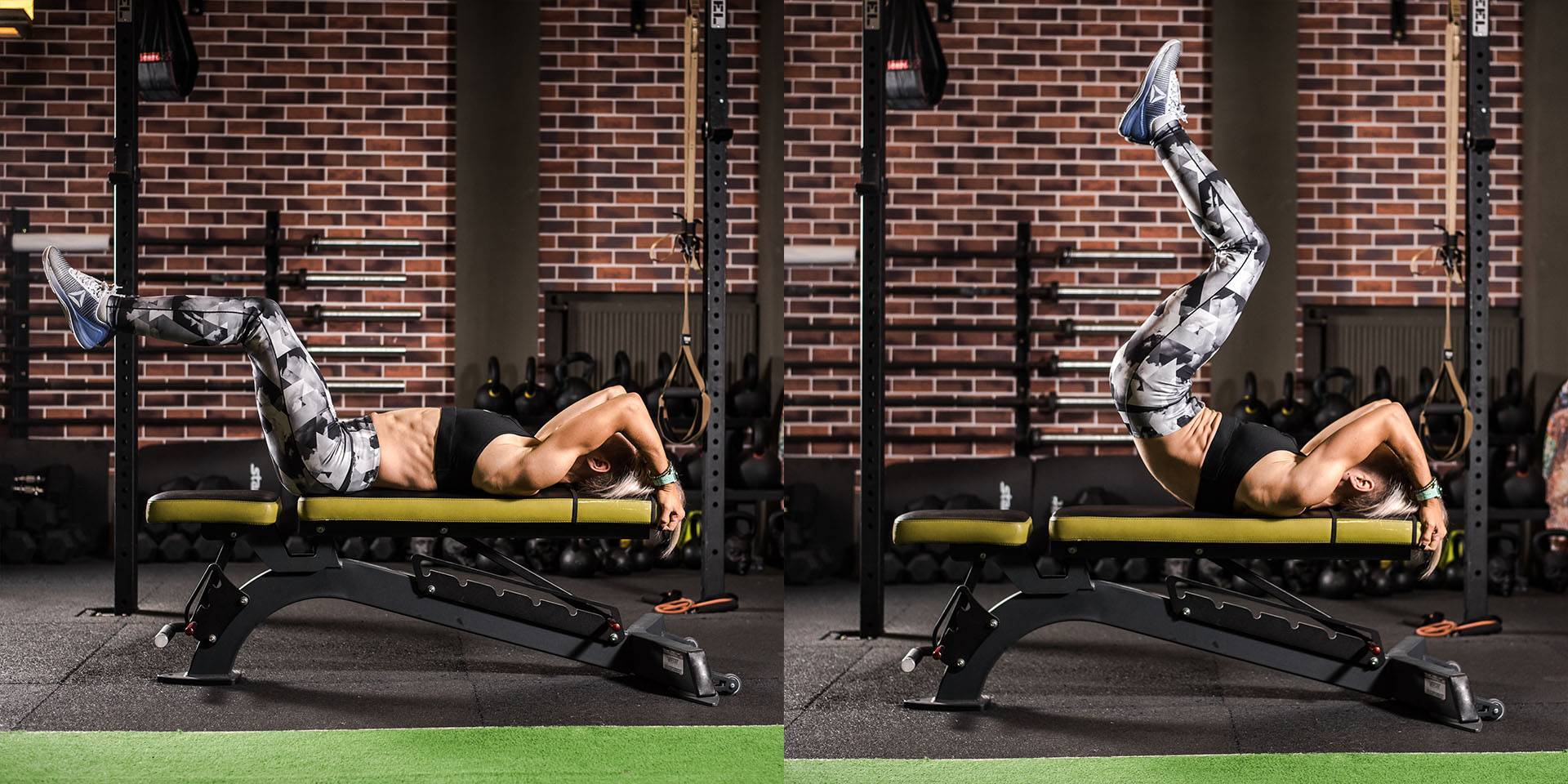 Выгибают поясничный отдел спины. Допускать этого нельзя, иначе можно просто потянуть спину. Она должна быть плотно прижатой к полу или наклонной скамье.