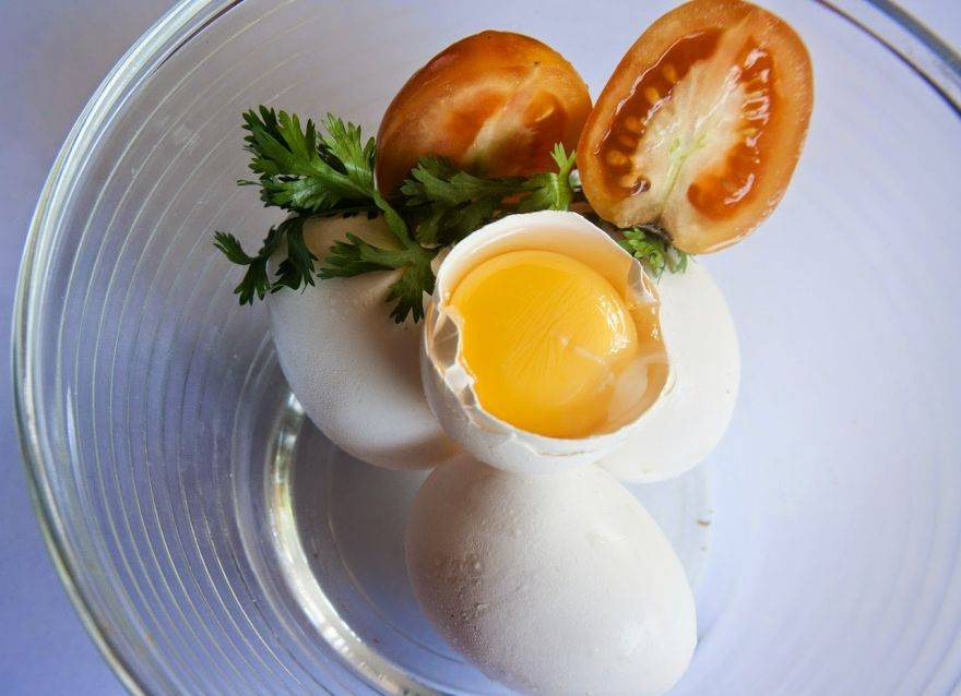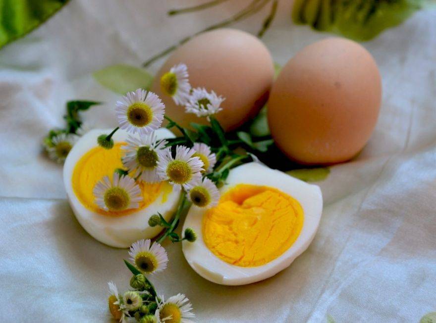 Яйца просто отваривают всмятку (так оно лучше усваивается организмом) без добавлений соли и пряностей.