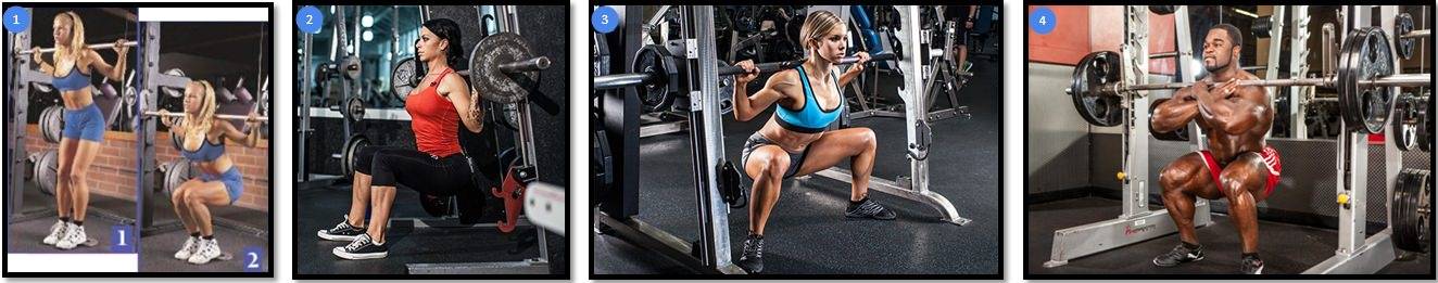 На тренажере Смита можно экспериментировать с различными вариантами приседаний, которые могут, хотя и не значительно, но отличаться от базовых движений. В зависимости от того, как будут поставлены ноги, зависит уровень нагрузки на конкретные мышцы ног. Например: