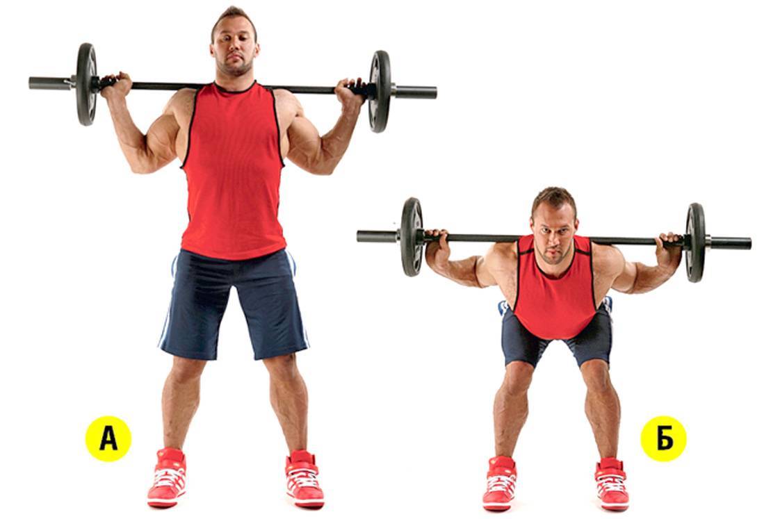 Держать штангу следует чуть ниже плеч, чтобы весь вес приходился не на спину, а на ноги и ягодицы.
