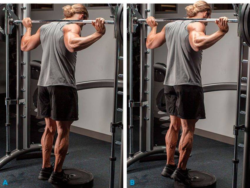 Не в каждом тренажерном зале, к сожалению, есть станок для работы над икроножными мышцами. Если это ваш случай, подъемы выполняют либо в Смите, либо со штангой. Чтобы имитировать всю биомеханику упражнения в тренажере, под носки следует подложить небольшую платформу. Это позволяет увеличить амплитуду движения и растянуть икры в самой крайней нижней точке. Данное условие является обязательным. Отсутствие платформы мгновенно снизит эффективность упражнения наполовину, и, нагрузка станет неполноценной. Увлекаться слишком большими весами не рекомендуется, поскольку нужно чувствовать работу каждой мышцы, а не просто поднимаемые килограммы.