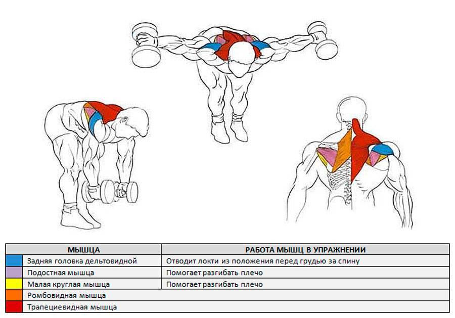Как накачать плечи, с помощью разведений в наклоне? Прежде чем приступать к описанию техники, кратко охарактеризуем само упражнение. Основная мышца, на которую приходится большая часть нагрузки при его выполнении – задний пучок «дельт». Он принимает активное участие в движениях плечевого сустава, таких, как отведение и маховое движение назад. Развитие этой мышечной зоны очень быстро отражается на внешнем виде спортсмена – придает рельефной «бугристости» спине и дополнительный объем рукам при взгляде сбоку.