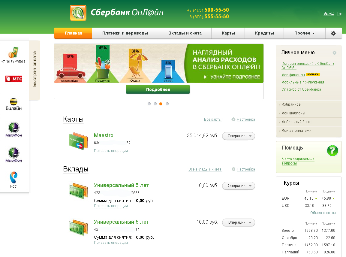 Раскроется ваша «Главная» страница (наверху в зелёной полосе она высветится оранжевым), где указаны все счета, карты и суммы на них. Рассмотрите, что написано сверху, сбоку, внизу. Никто ведь не торопит, не раздражается. Много интересного и нужного можно там увидеть.