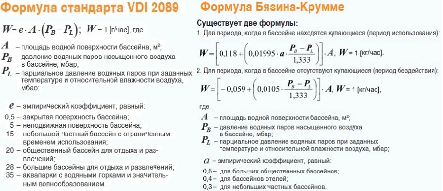 До 2012 года объем влаги в бассейне рассчитывался по 3 разным методикам, и результат сильно различался. С выходом норматива АВОК» 7.5-2012 методика стала одна, но продавцы выпускают таблицы подбора по старым расчетам, чтобы выгодно продать оборудование.