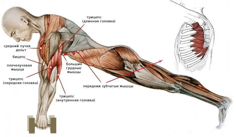 Дельтовидные мышцы, передние и задние, работают всегда, когда вы двигаете руками. Как уже упоминалось, мышцы пресса при отжимании находятся в постоянном напряжении, то есть нагружаются в статическом режиме, что приводит к их укреплению и повышению выносливости. Перечисленные группы мышц работают при любых видах отжиманий.