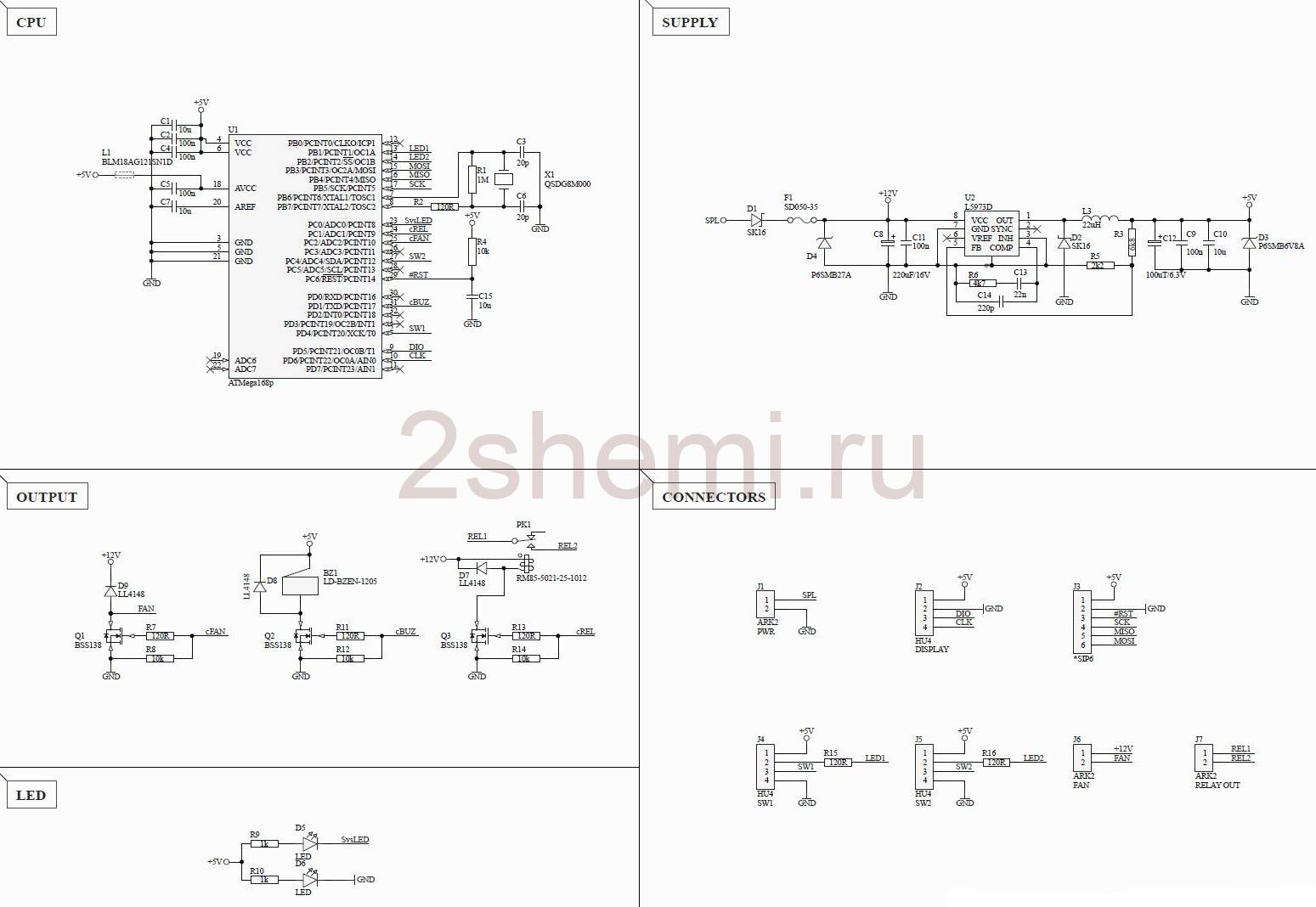 Контроллер представляет собой простую печатную плату, на которой расположен преобразователь L5973D 12 В — 5 В постоянного тока, Atmega88, все соответствующие разъемы (под кнопки, дисплей, разъемы питания и релейный выход) и звуковой сигнал с генератором. В качестве дисплея использовались готовые модули на базе чипа TM1637. Короче говоря, это контроллер мультиплексного светодиодного дисплея с регулируемой яркостью и поддержкой кнопок.