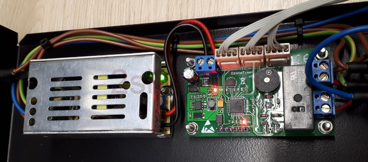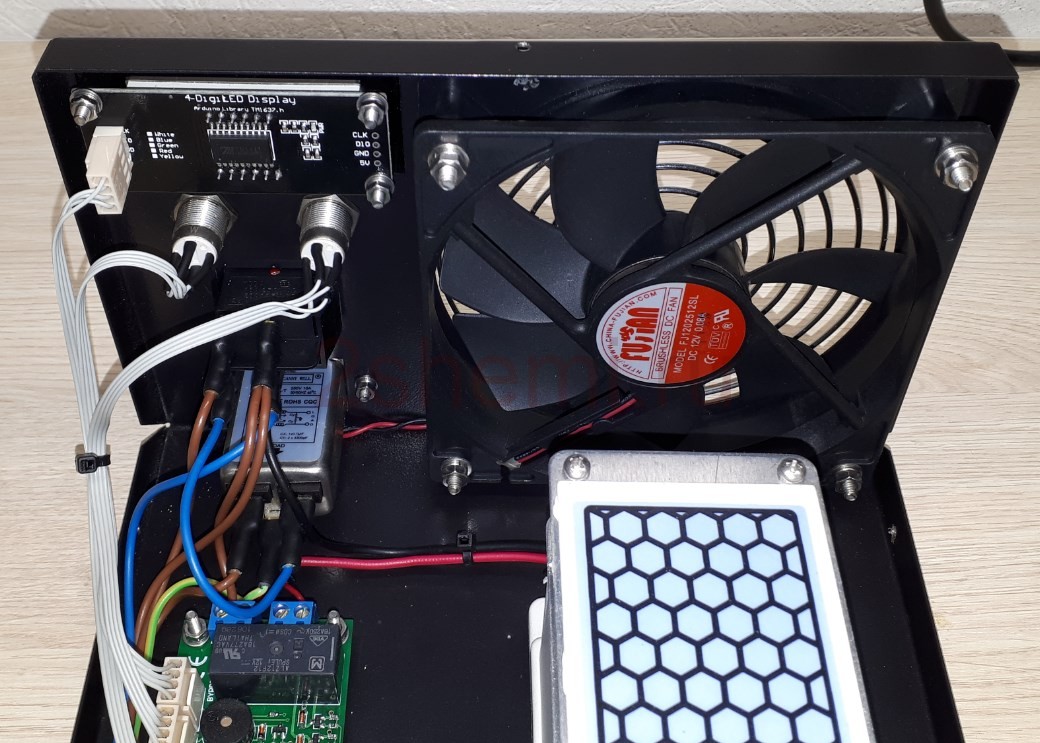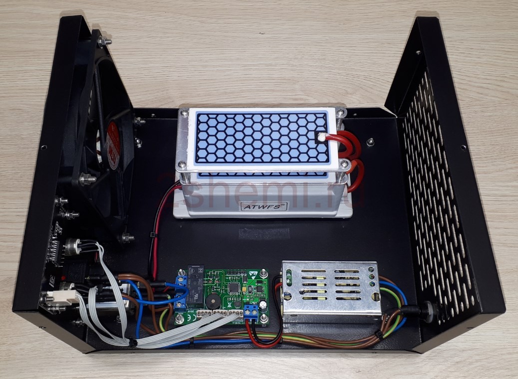 На задней панели устройства есть гнездо с предохранителем. Внутри, в дополнение к озонатору, также стоит источник питания 220 В переменного тока в 12 В постоянного тока и система управления. Корпус спроектирован так, что подойдут две системы для производства озона, что повысит эффективность всего устройства. Пока собрана одна и вроде этого достаточно.
