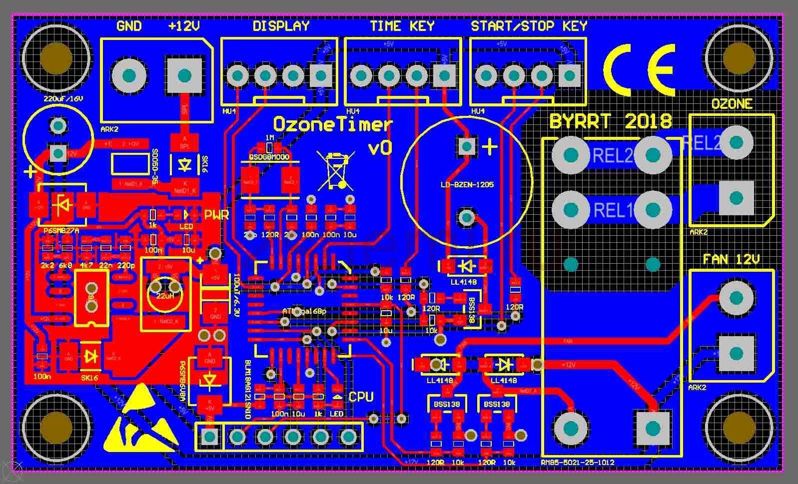 Кнопка ПУСК / СТОП запускает цикл. Каждый цикл начинается с включения питания вентилятора и обратного отсчета 10 секунд, чтобы успеть закрыть дверь в автомобиле или покинуть комнату. Через 10 секунд раздастся длинный звуковой сигнал, реле включится и начнется цикл озонирования. По окончании времени (после отсчета установленного времени до нуля) реле озонатор выключит и в течение следующей минуты схема звуком сигнализирует об окончании процесса (прерывистый сигнал 1 Гц), на дисплее мигает слово «End», а через минуту оно горит постоянно, вентилятор выключается.