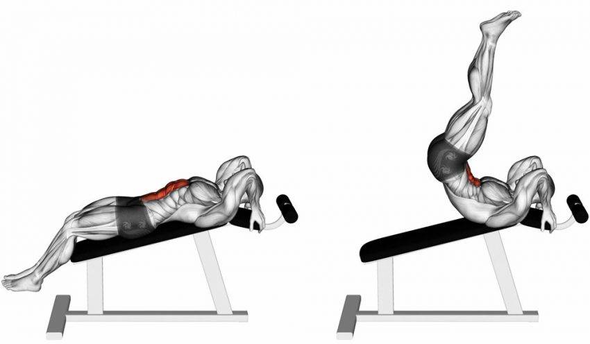 - Наклонная скамья с валиками только для упора голеней внизу. На такую скамью атлет ложится спиной, сгибает ноги в коленях и заводит голеностопные суставы за валики. Бедра и спина при этом составляют одну линию. В данном случае нагрузка на поясницу больше, чем в предыдущем.
