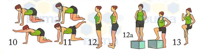 12. Подъем с пяток на носки (усложненный вариант — поднятие на небольшой скамеечке на одну ногу и другую, 5-10 раз для начинающих, дальше 15-20 раз);