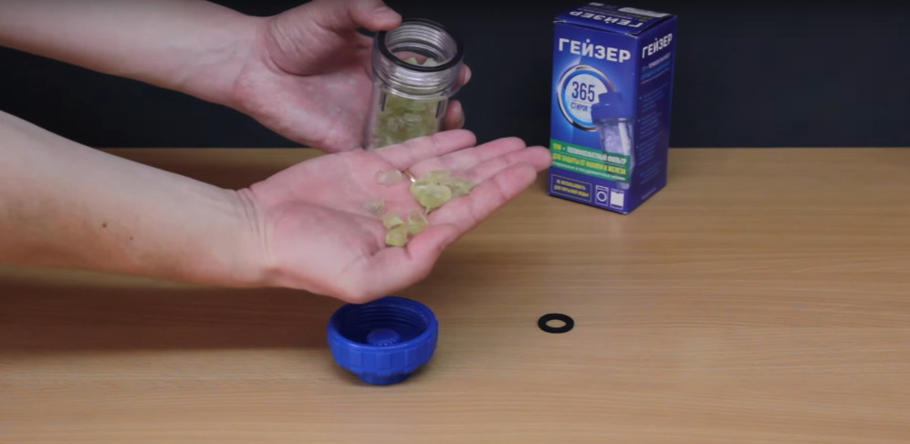 Растворимость засыпки зависит от фракции. Если фракция крупная, она растворяется, но не так быстро. Однако на поверхности кристаллов со временем образуется пленка, которая выглядит как ржавчина и начинает препятствовать растворению. Поэтому в инструкции и пишут, что загрузку рекомендуется менять раз в пол года.